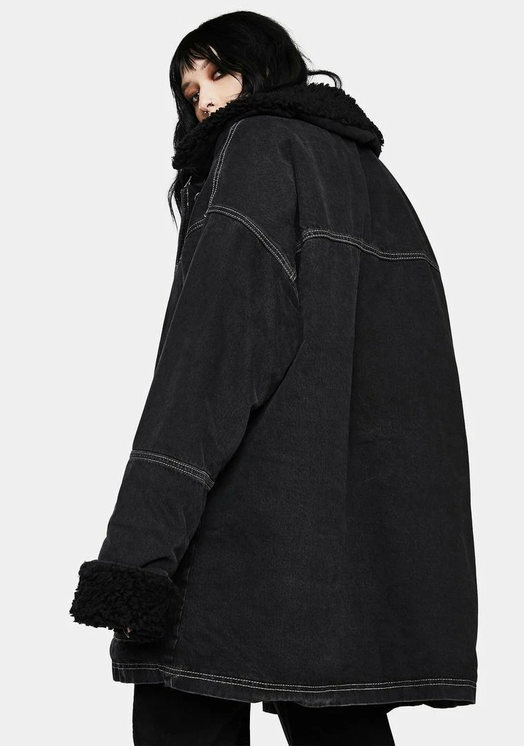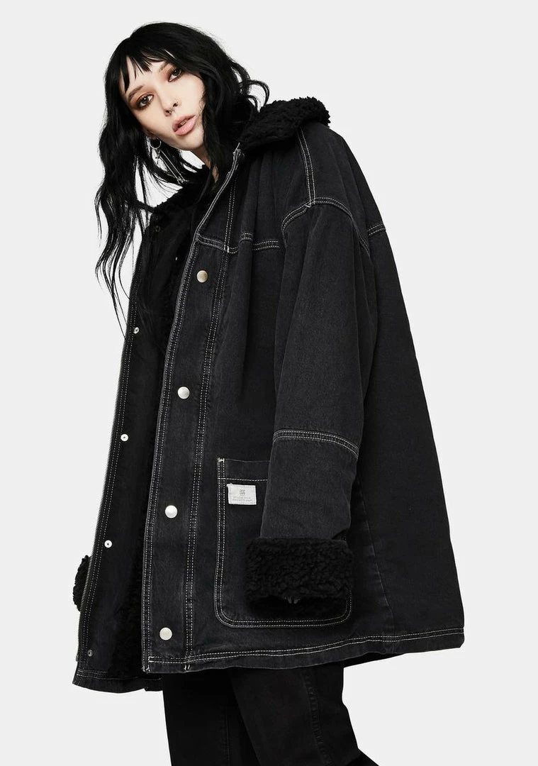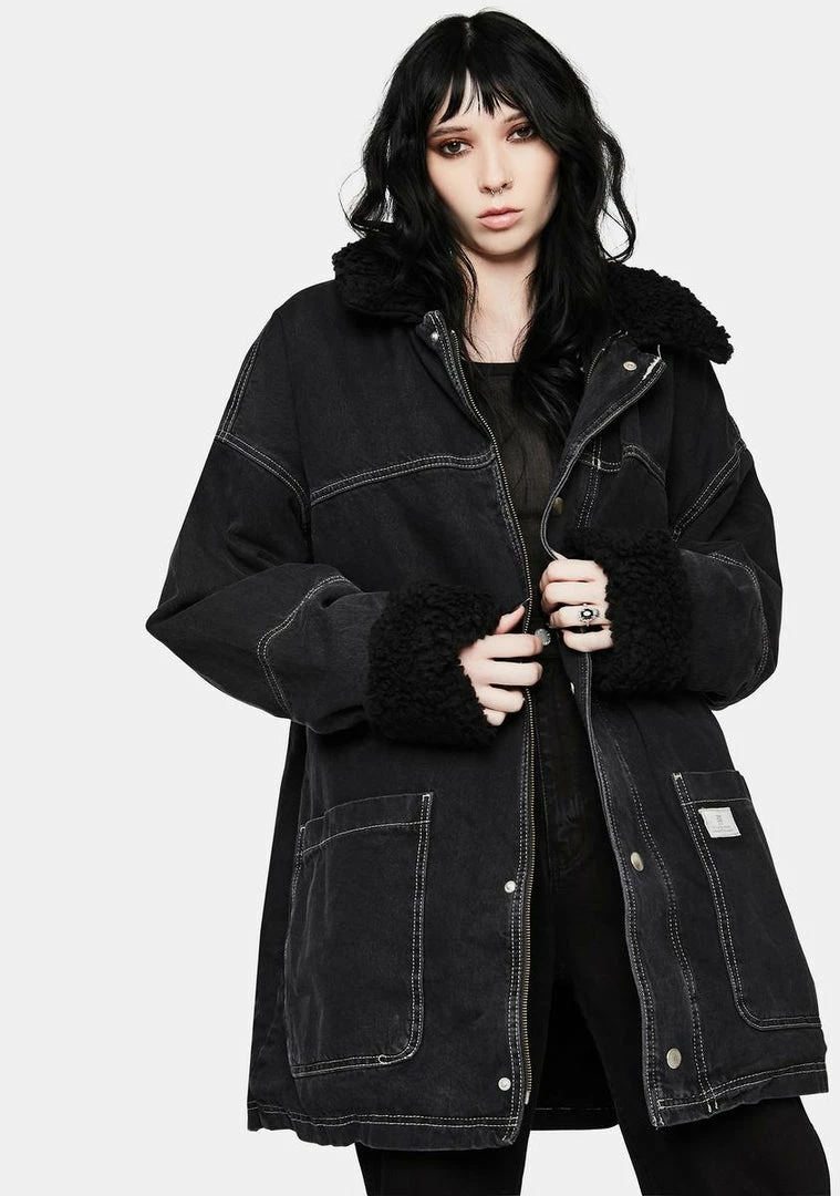 features exposed contrast stitching, button front closure, super big side pockets, and fur trim at the sleeves and collar.