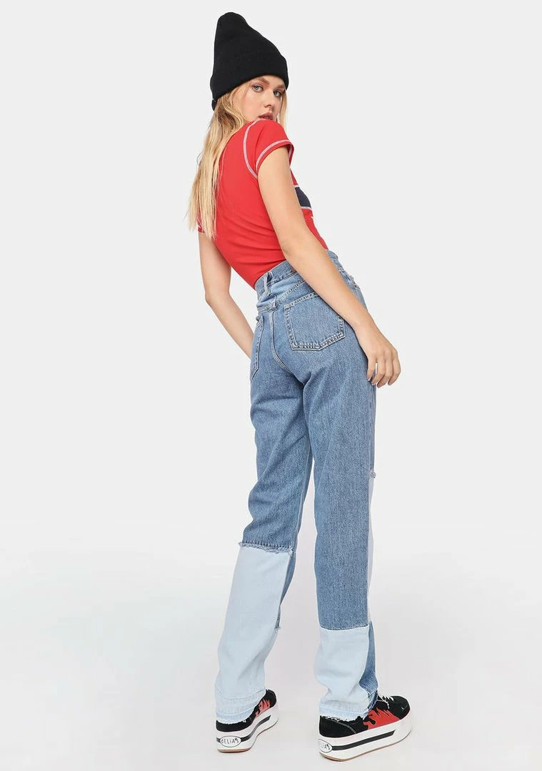 features a high-rise waist, a patchwork denim construction, a straight leg silhouette with raw edge hems, and a zip fly closure.