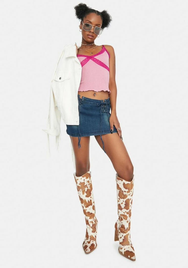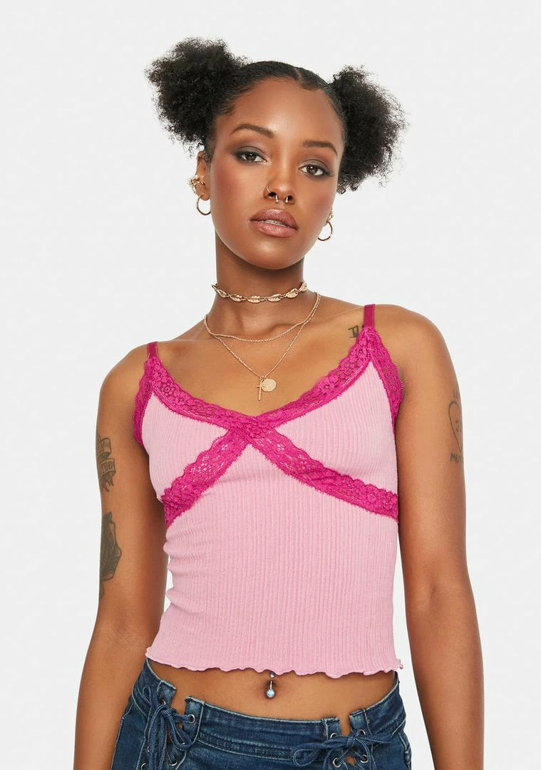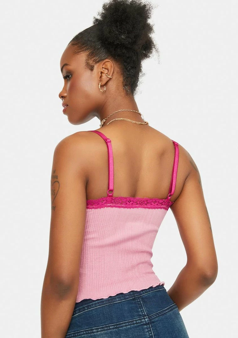 cuz you are the talk of the town. This cami has lace trim along the neckline and bust, adjustable cami straps, and a lettuce edge hem.