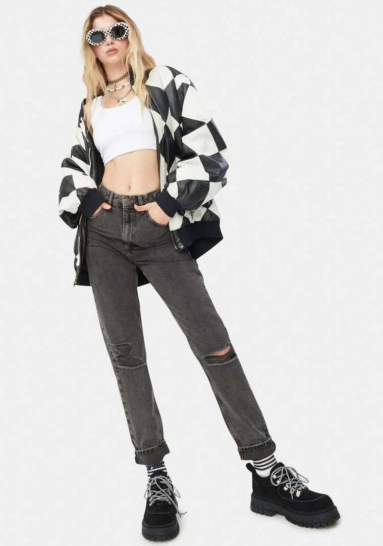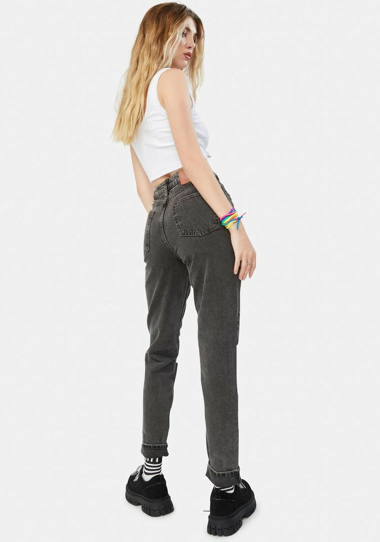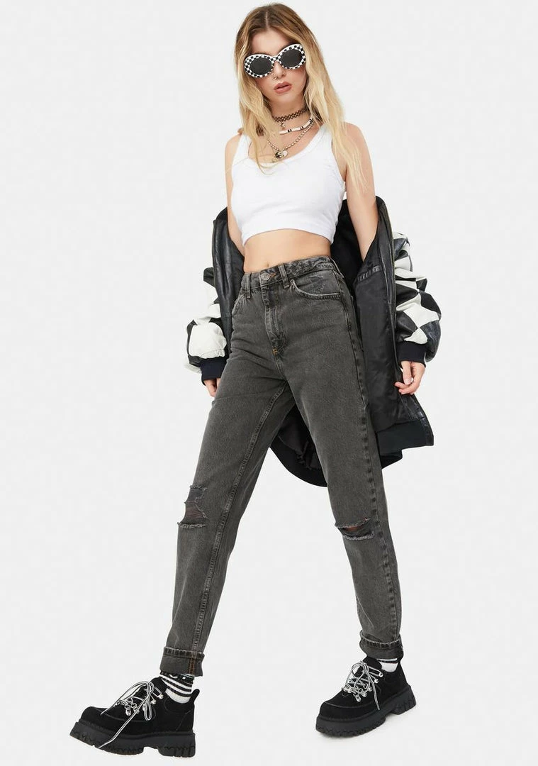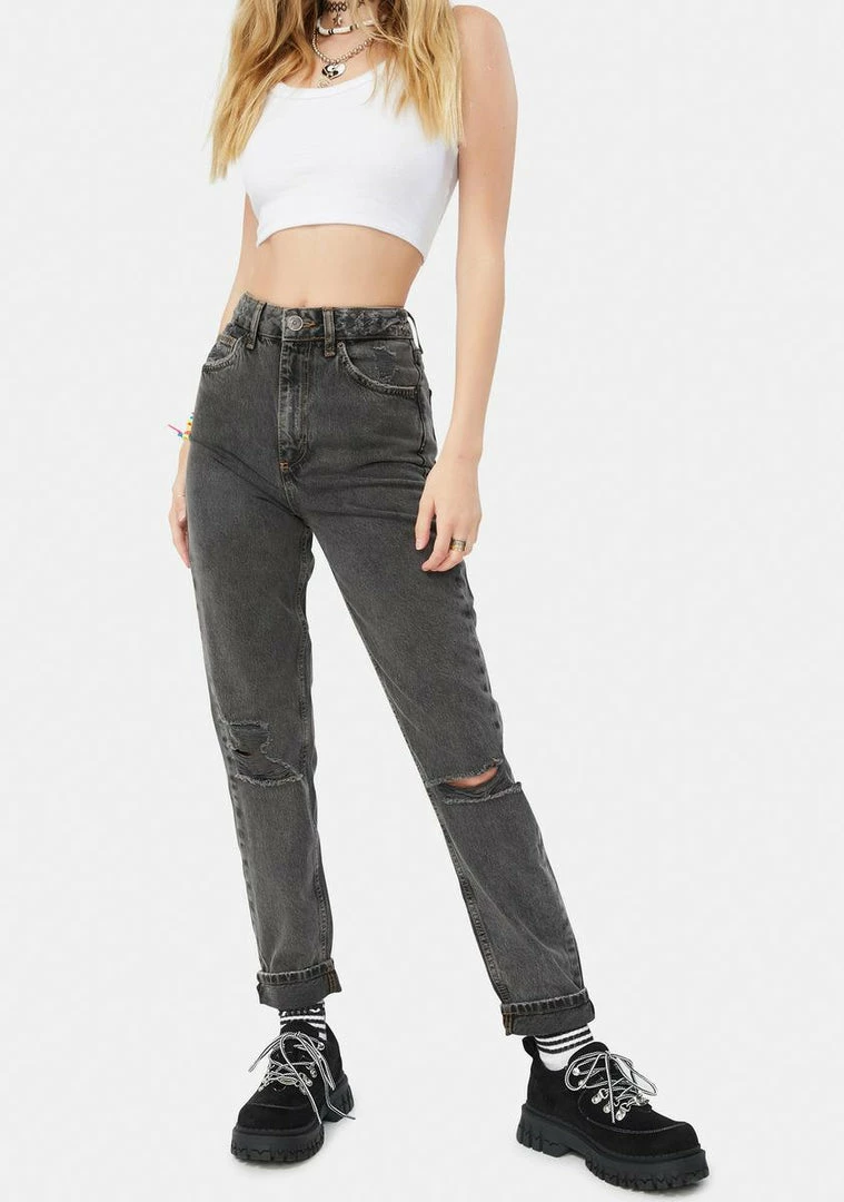 feature a high waisted straight leg fit, ripped knees, a classic five pocket design, and a buttoned zip closure.