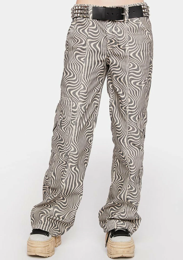 have a cotton construction, a swirl print all over, cargo pockets, regular pockets, a low rise fit, and a button and zip closure.